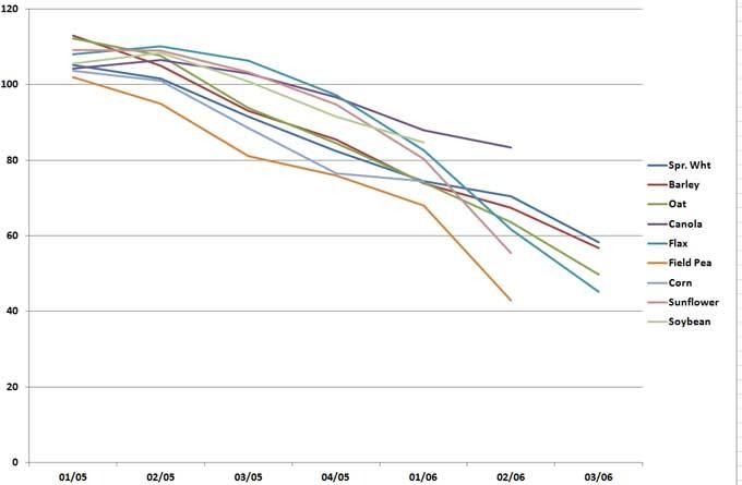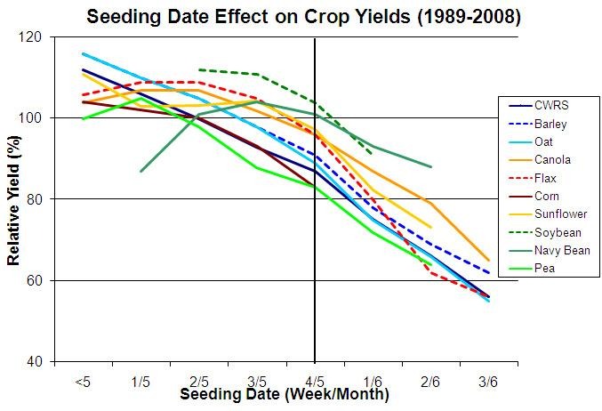La figure 4 montre, pour chaque semaine d’ensemencement, le rendement relatif moyen déclaré des cultures de blé roux de printemps, d’orge, d’avoine, de pois, de lin et de canola argentin, pour la période de 21 ans qui s’étend de 1981 à 2001 inclusivement. En général, plus les céréales étaient semées tôt, plus leur rendement était élevé. De plus, leur rendement diminuait plus rapidement que celui des cultures à feuilles larges pour chaque semaine où l’ensemencement était retardé. La prévalence croissante de maladies foliaires et d’autres maladies liées à un ensemencement tardif semble être le facteur principal qui limite le rendement des céréales semées plus tardivement.